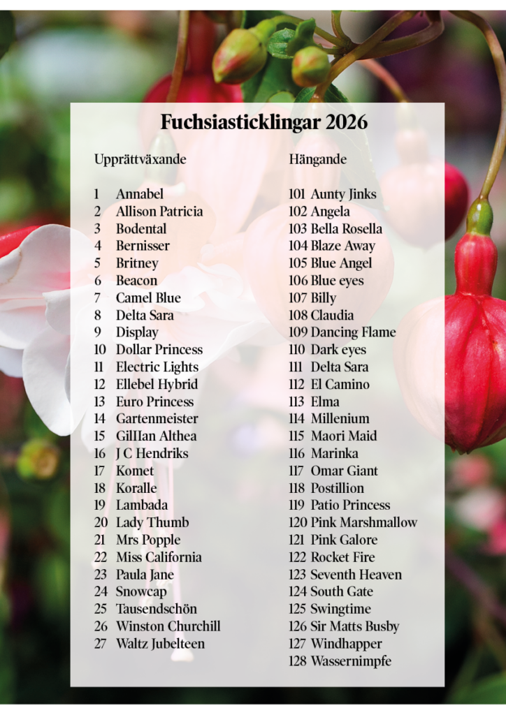 Nu har vi äntligen fått hem årets efterlängtade fuchsiasticklingar – redo att sätta färg på din uteplats, balkong eller fönsterbräda! Fuchsia är en riktig favorit med sina eleganta blommor i sprakande färger, som skapar en romantisk och livfull atmosfär var de än placeras.