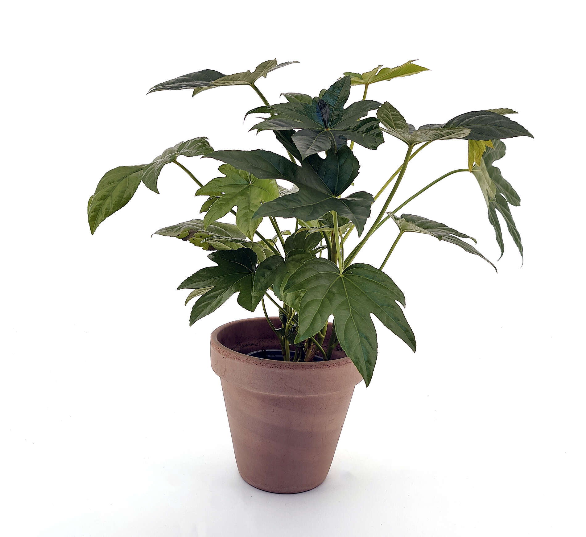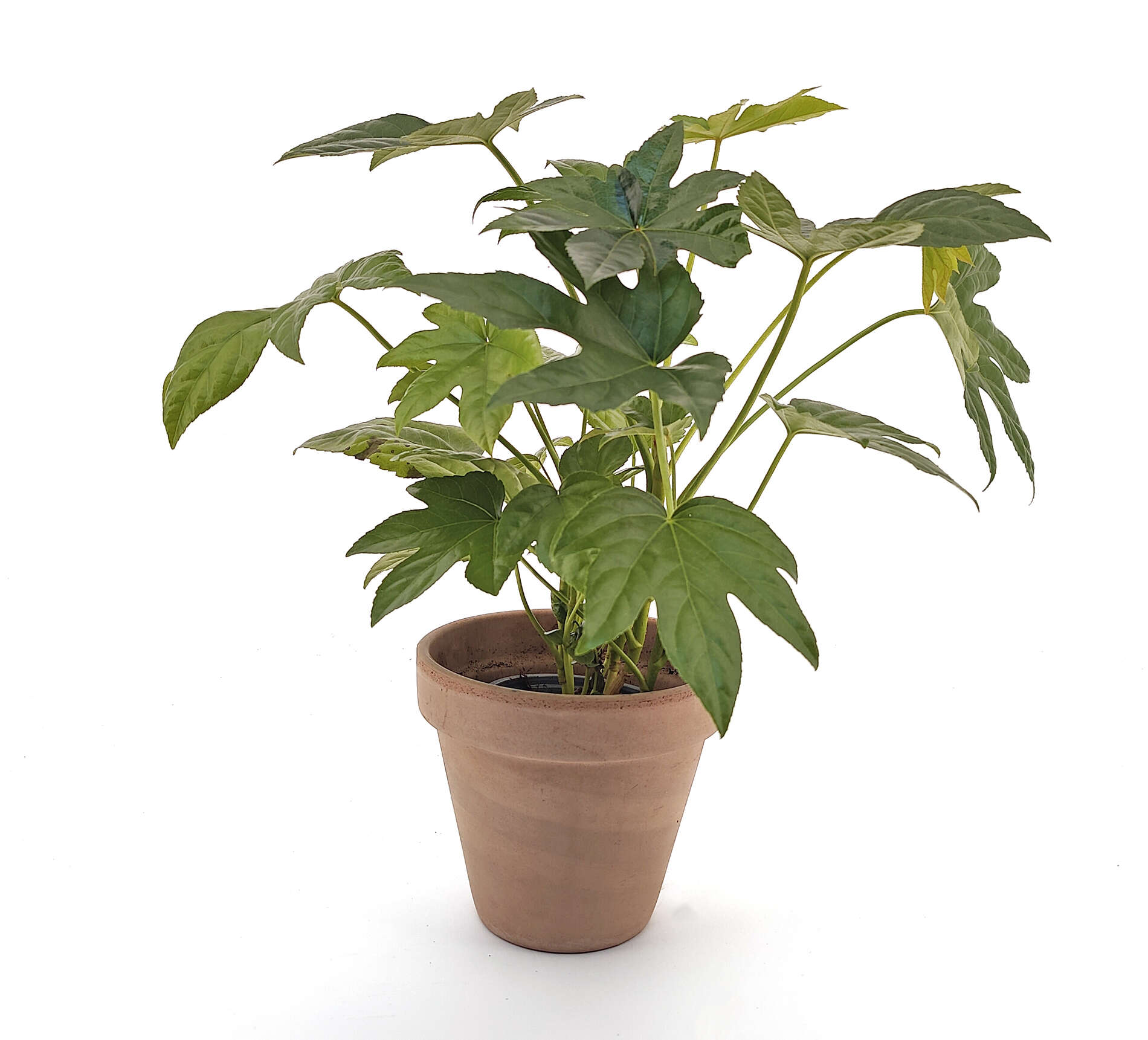 Aralia, eller Fatsia japonica, är en robust och dekorativ växt som kännetecknas av sina stora, glänsande och handflikiga blad. Den ger ett exotiskt inslag till hemmet med sin tropiska känsla och fungerar både som krukväxt inomhus och som trädgårdsväxt i mildare klimat.