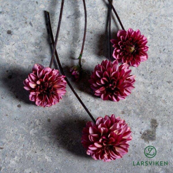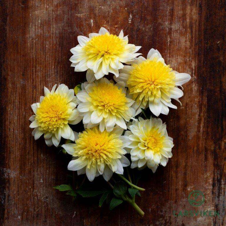 En unik dahliasort med lite ovanligare utseende. Mitten är fylld till bristningsgränsen av ljusgula blomblad, för att kompletteras med kritvita kronblad som bildar en enkel krans runt om. En favorit bland många av florister för sin karaktär och sitt långa vasliv. Blommar rikligt hela säsongen.
