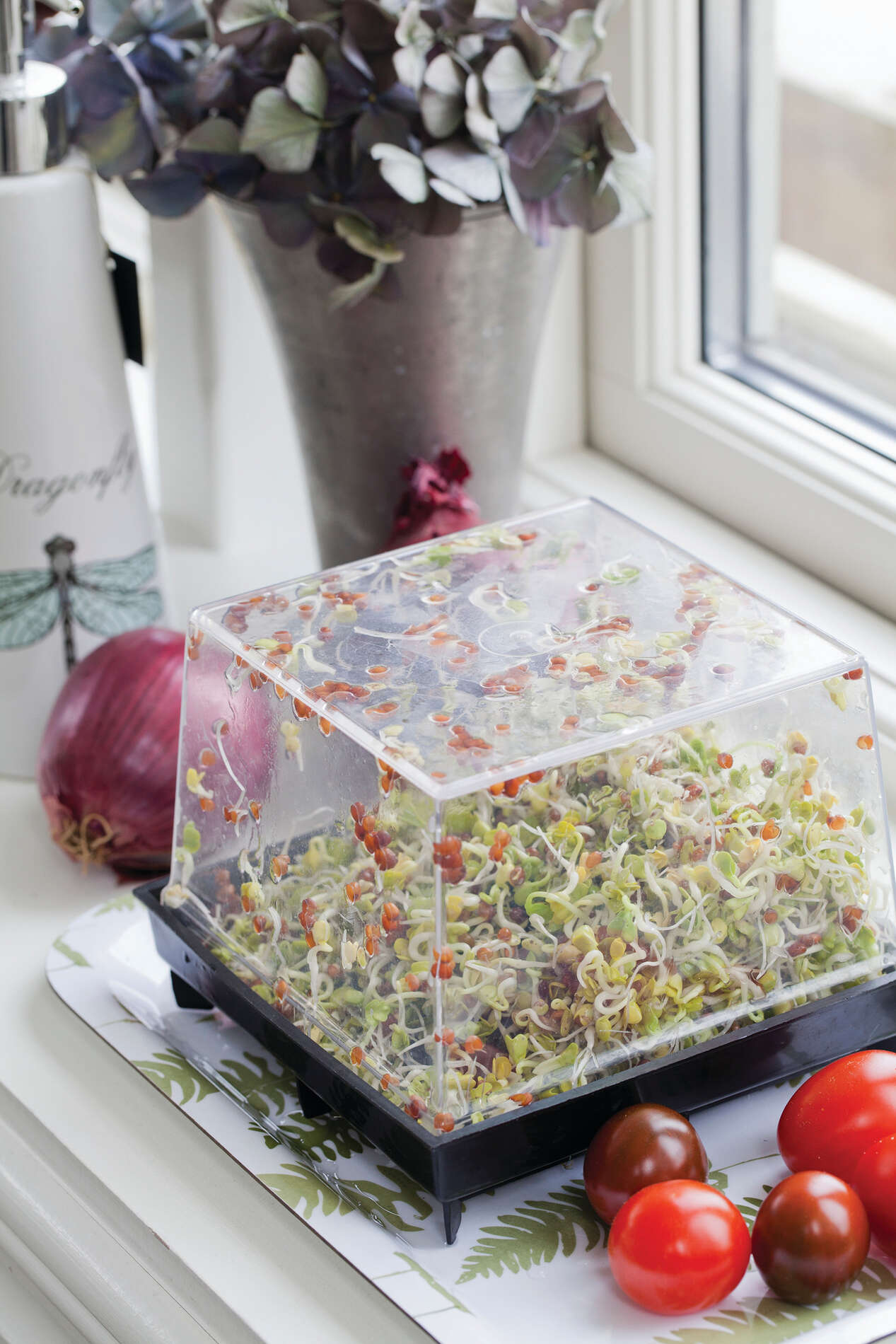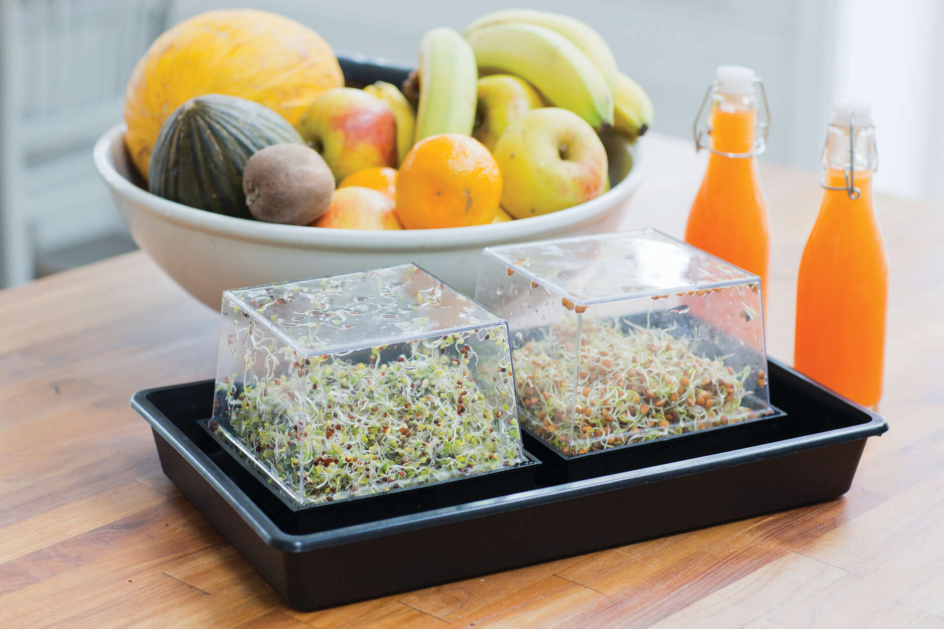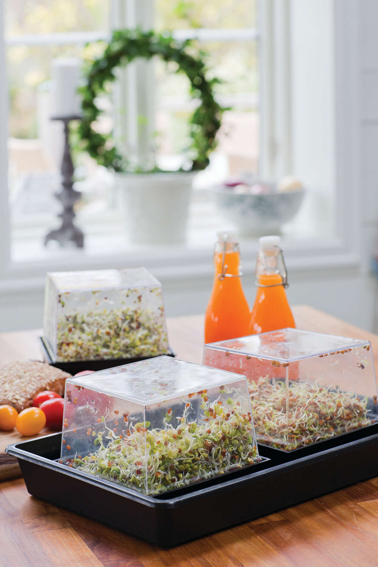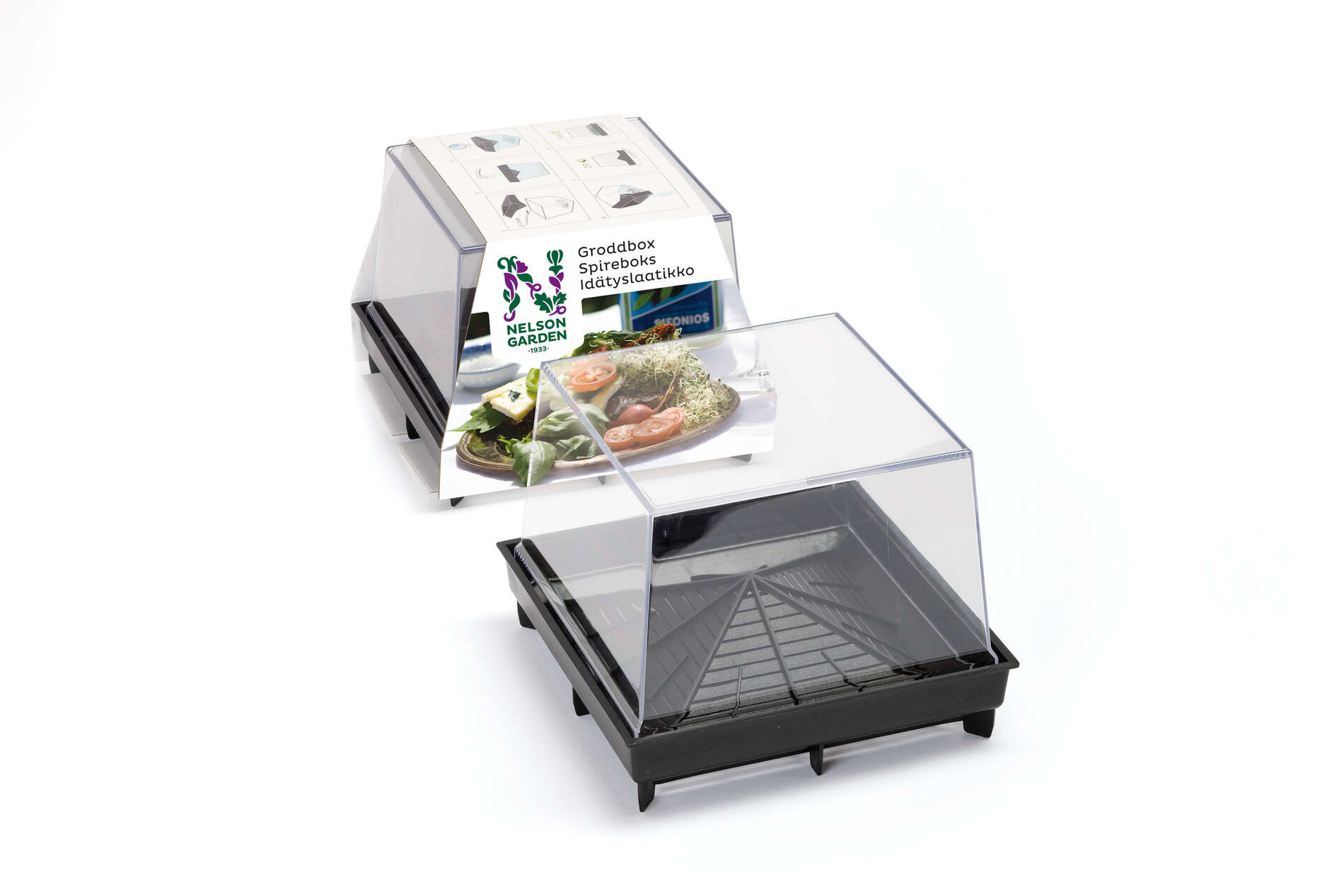 Med hjälp av groddboxen är det enkelt att grodda olika sorters fröer t.ex. alfalfa. Då fröna gror bildas mängder av nyttiga vitaminer och mineraler. På varm plats, 20-25 °C, är groddarna klara efter 5-10 dagar, beroende på sort. Groddar bör förvaras i kylskåp och de är då hållbara i 4-5 dagar. Tips! Vänd groddboxen upp och ned i kylskåpet vid förvaringen. Mått: 15 x 15 cm.
