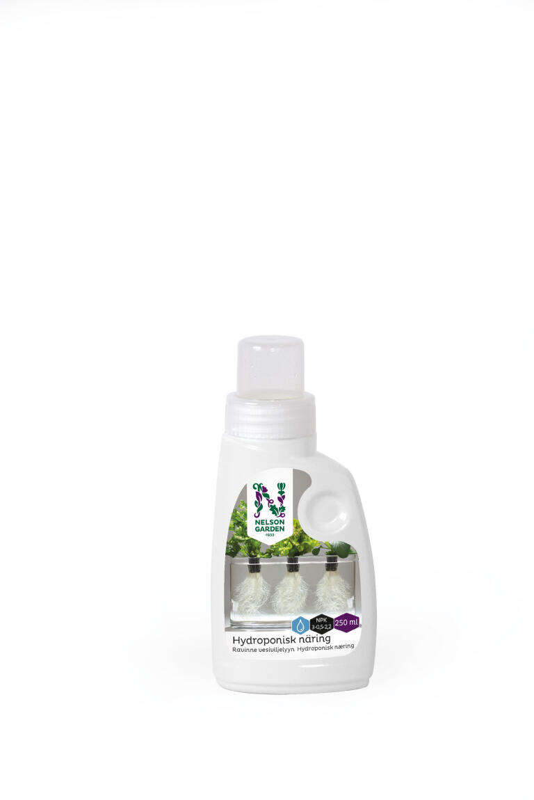 Växtnäring, specialanpassad för hydroponisk odling, d.v.s. odling i vatten. Flaska med praktisk skala i korken som gör näringen lätt att dosera. NPK 3-0,5-2,2 — Dosering: 6 ml näring per 2 liter vatten. Skaka flaskan väl före varje dosering.