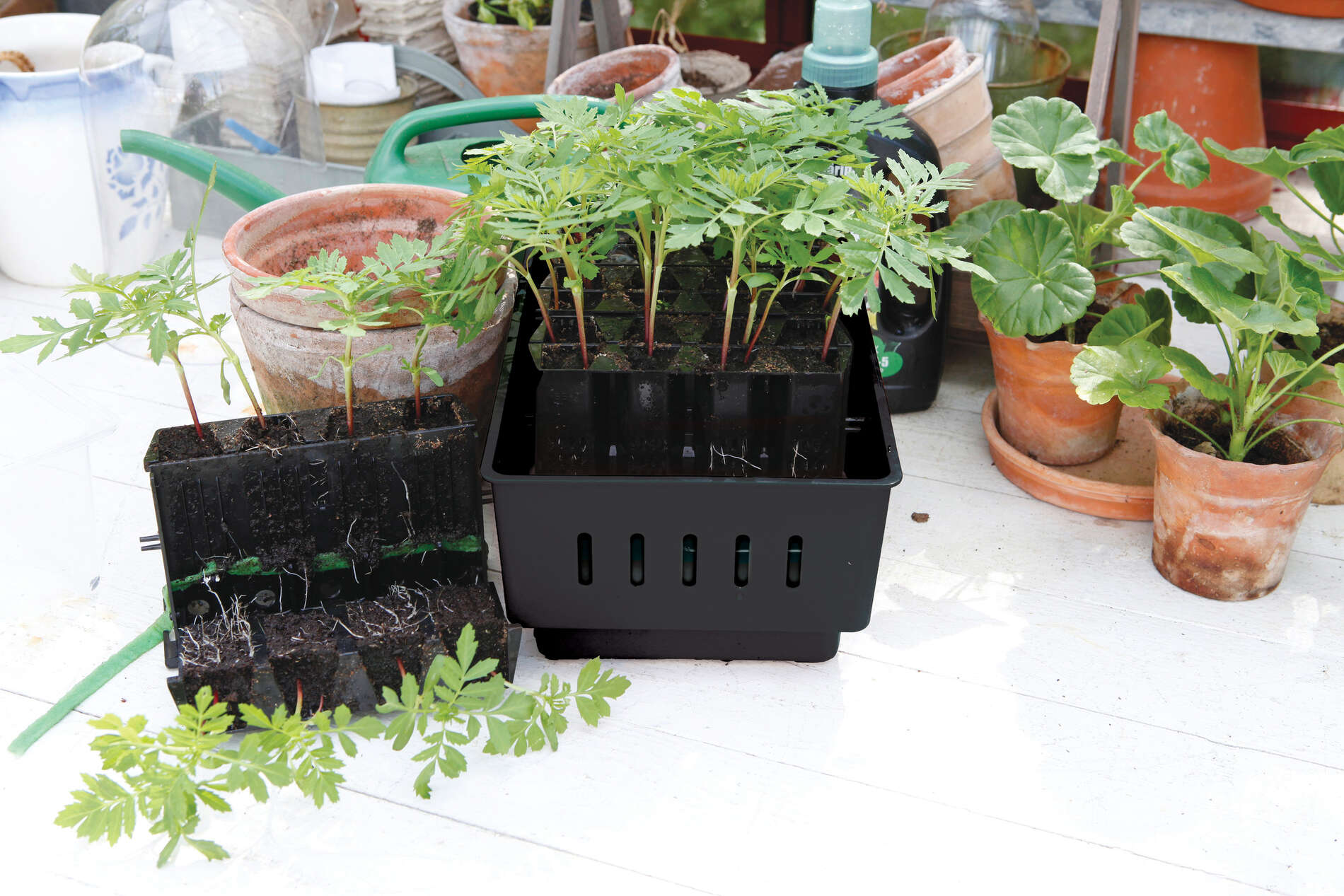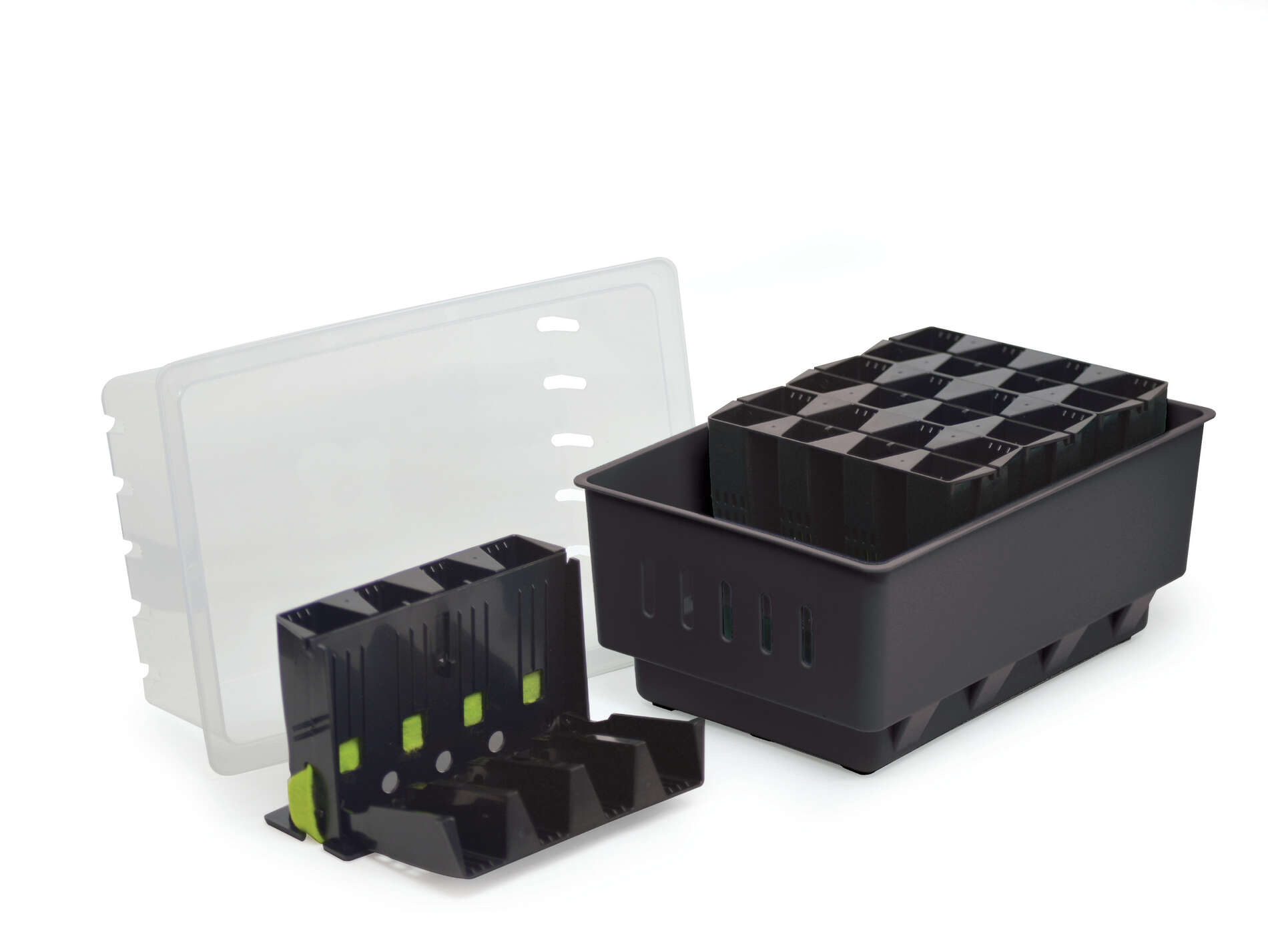 Rootmaster är ett kompakt minidrivhus med självbevattningsfunktion vilket gör odlingen enkel – fyll på vatten i tråget vid behov och låt de späda plantorna spira. När rötterna efter hand letar sig ut ur pluggcellernas ventilationshål torkar rotändarna ut och nya rötter bildas högre upp. Med hjälp av denna luftbeskärning skapas djupa och välutvecklade rotsystem. Dessutom möjliggörs en skonsam hantering av plantorna tack vare att pluggcellerna går att öppnas upp likt en bok. Det svarta bottentråget är tillverkat av återvunnet material. Tråget och locket är av polypropen (PP), plugghållare och pluggceller av polystyren (PS). Alla delar är av hög kvalitet. Förpackningen innehåller även 8 bevattningsband som efter odling kan sköljas upp och återanvändas. Svart. Mått: B 19,5 cm, L 29 cm, H 21 cm.