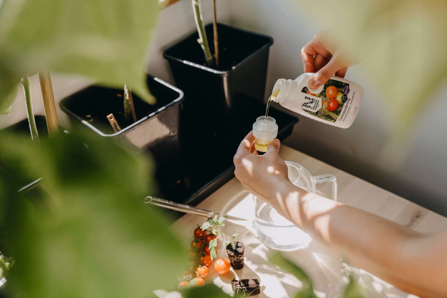 Flytande mineralisk näring för tomatplantor i lätthanterlig förpackning. Innehåller mikronäringsämnen. Blandas i vatten. NPK 7-1,3-5